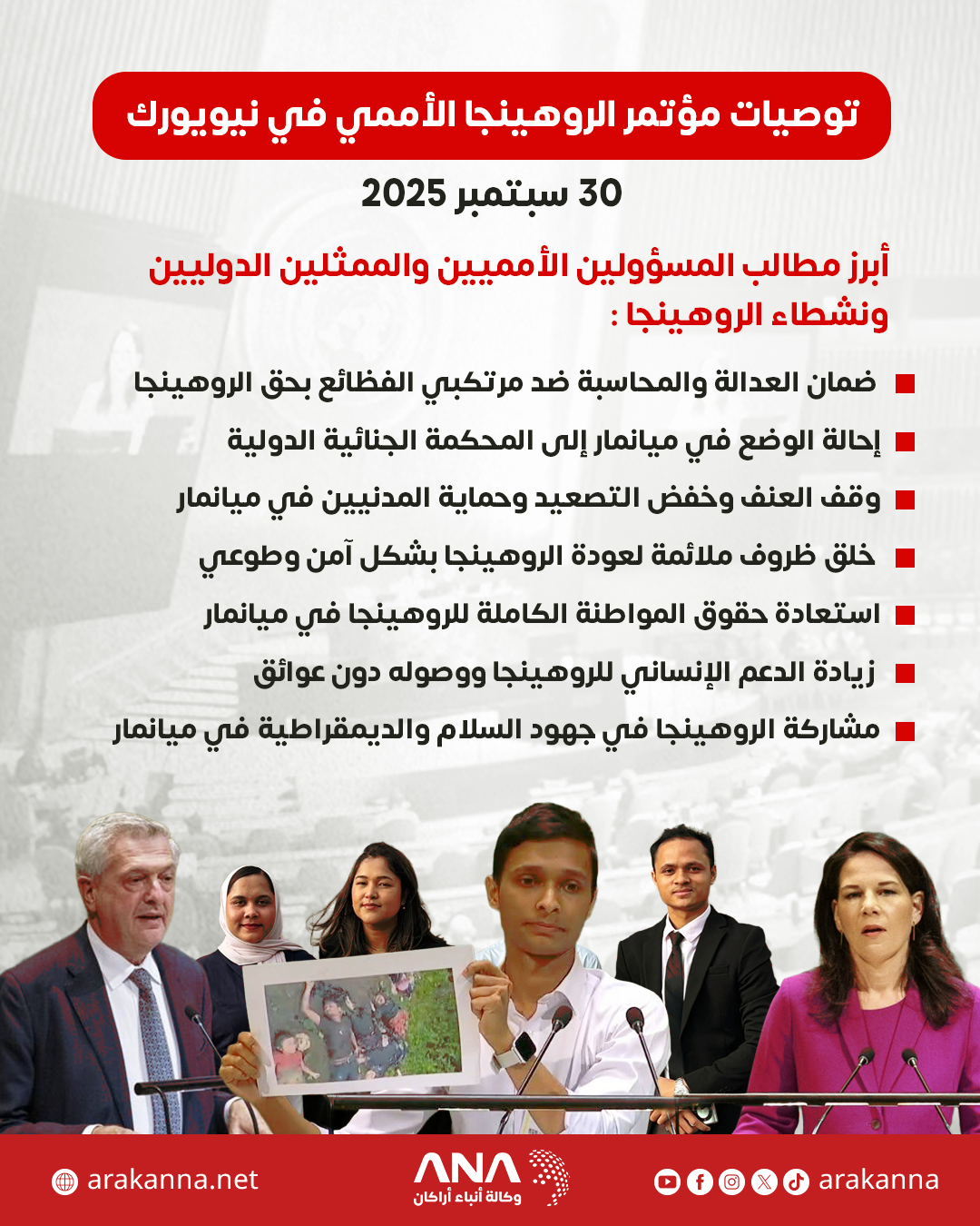 إنفوجراف يوضح أبرز مطالب المسؤولين الأمميين والممثلين الدوليين ونشطاء الروهينجا خلال المؤتمر رفيع المستوى حول أزمة الروهينجا ضمن فعاليات الدورة 80 للجمعية العامة للأمم المتحدة التي انعقدت في نيويورك.
