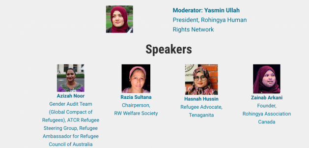 وقالت ياسمين إن الندوة التي أقيمت عبر الإنترنت هدفت إلى تزويد نساء الروهنغيا المساحة لسرد قصصهن الخاصة وإدراجهن في المحادثة الأكبر التي تدور حول حقوق الروهنغيا والإبادة الجماعية وأزمة اللاجئين حيث لا تُرى نساء الروهنغيا في طليعة الجهود المجتمعية.
